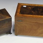 A George III rosewood tea caddy of sarcophagus form with fruitwood stringing, applied with gilt metal ring handles and paw feet, width 22cm, together with a George III mahogany tea caddy, width 31cm.