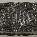 An Elizabeth II silver shaped rectangular pill box with hinged lid, decorated in relief with cherubs within scroll borders, Birmingham 1978 by Pepper & Hope, length 4.4cm, together with another silver rectangular pill box with hinged lid and engine turned decoration, Birmingham 1965 by D. Bros, length 3.4cm.