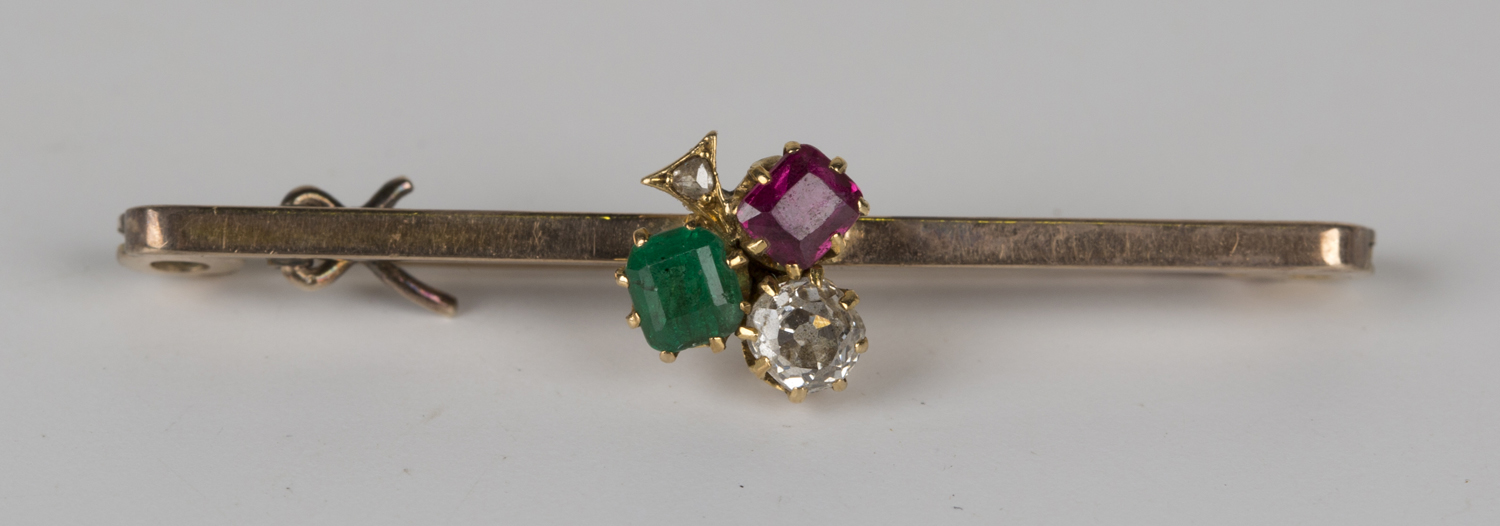 A gold, diamond, ruby and emerald bar brooch, the centre with a trefoil motif on a plain bar, detailed '9ct', further detailed '17' to the trefoil, width 3.9cm.