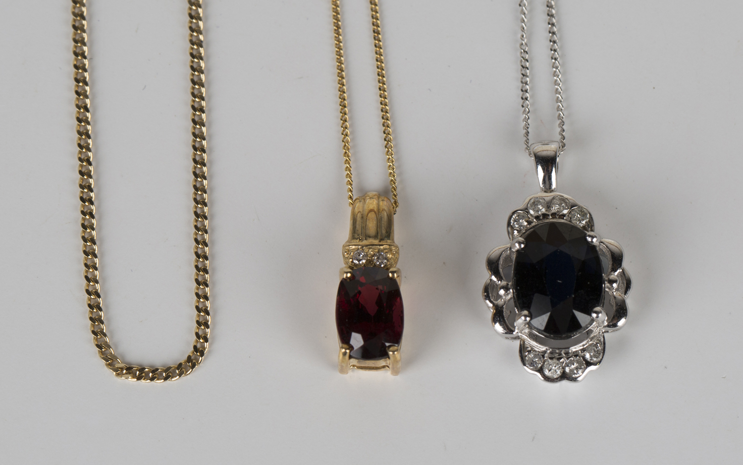 A 9ct gold, garnet and diamond pendant, length 1.7cm, with a 9ct gold neckchain, length 44.5cm, a 9ct white gold, sapphire and diamond pendant with a white gold neckchain, and a 9ct gold faceted curblink neckchain on a boltring clasp, length 50.5cm.