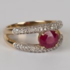 A 9ct gold ring, claw set with an oval cut ruby between circular cut diamond set two row sides in an openwork design, ring size approx R1/2.
