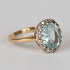 An 18ct gold aquamarine and diamond cluster ring, claw set with the oval cut aquamarine within a surround of circular cut diamonds, London 1982, ring size approx K.