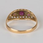 A George V 18ct gold, ruby and diamond ring, mounted with three circular cut rubies alternating with two pairs of rose cut diamonds, London 1910, ring size approx O.
