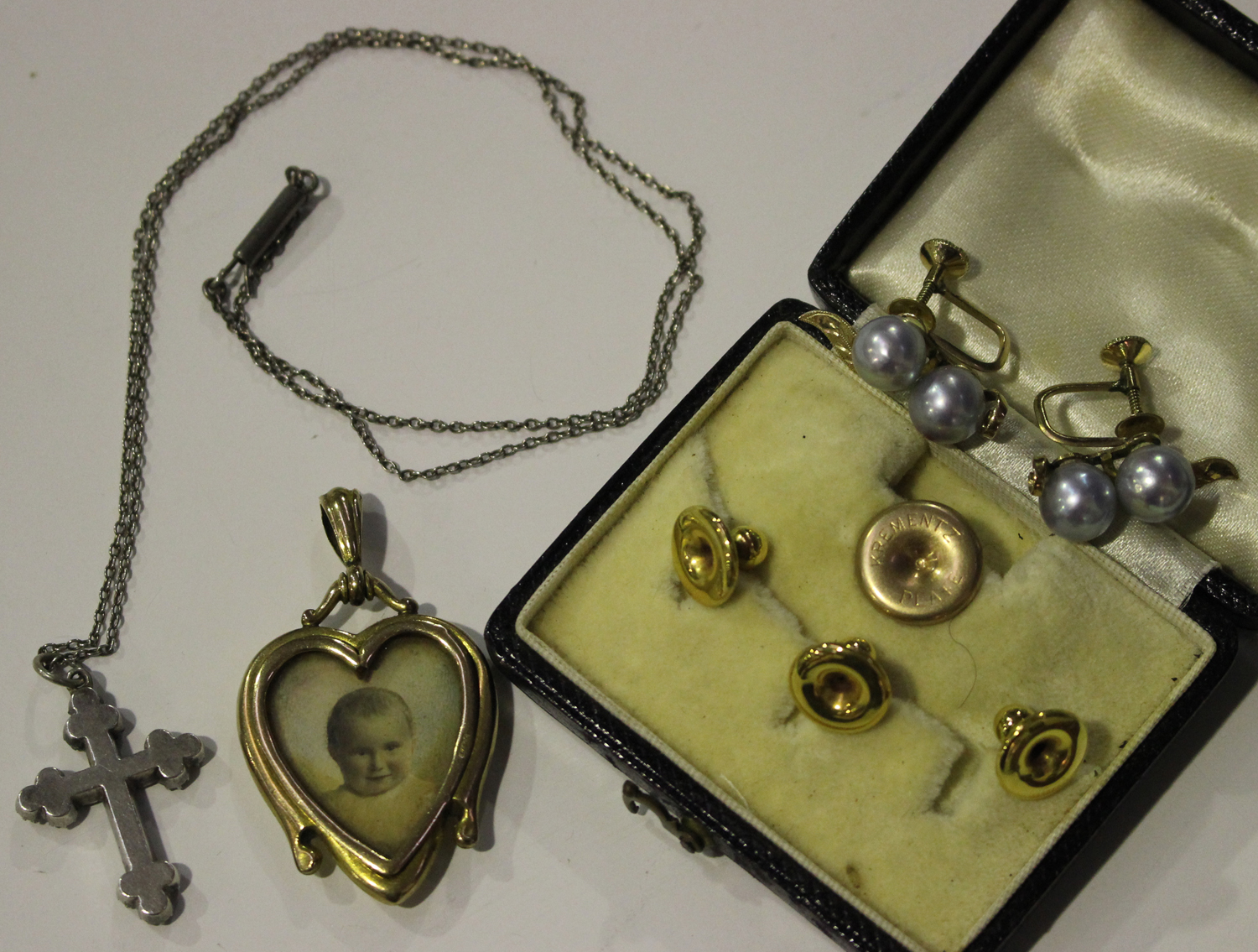 A 9ct gold heart shaped pendant locket, glazed with the portrait of a baby, length 4.5cm, a colourless paste set pendant cross with a neckchain, a pair of gold mounted grey tinted cultured pearl earrings, the screw fittings 'K14', six brooches, four rings, three gold studs, detailed '15ct', one plated stud and nine further items.
