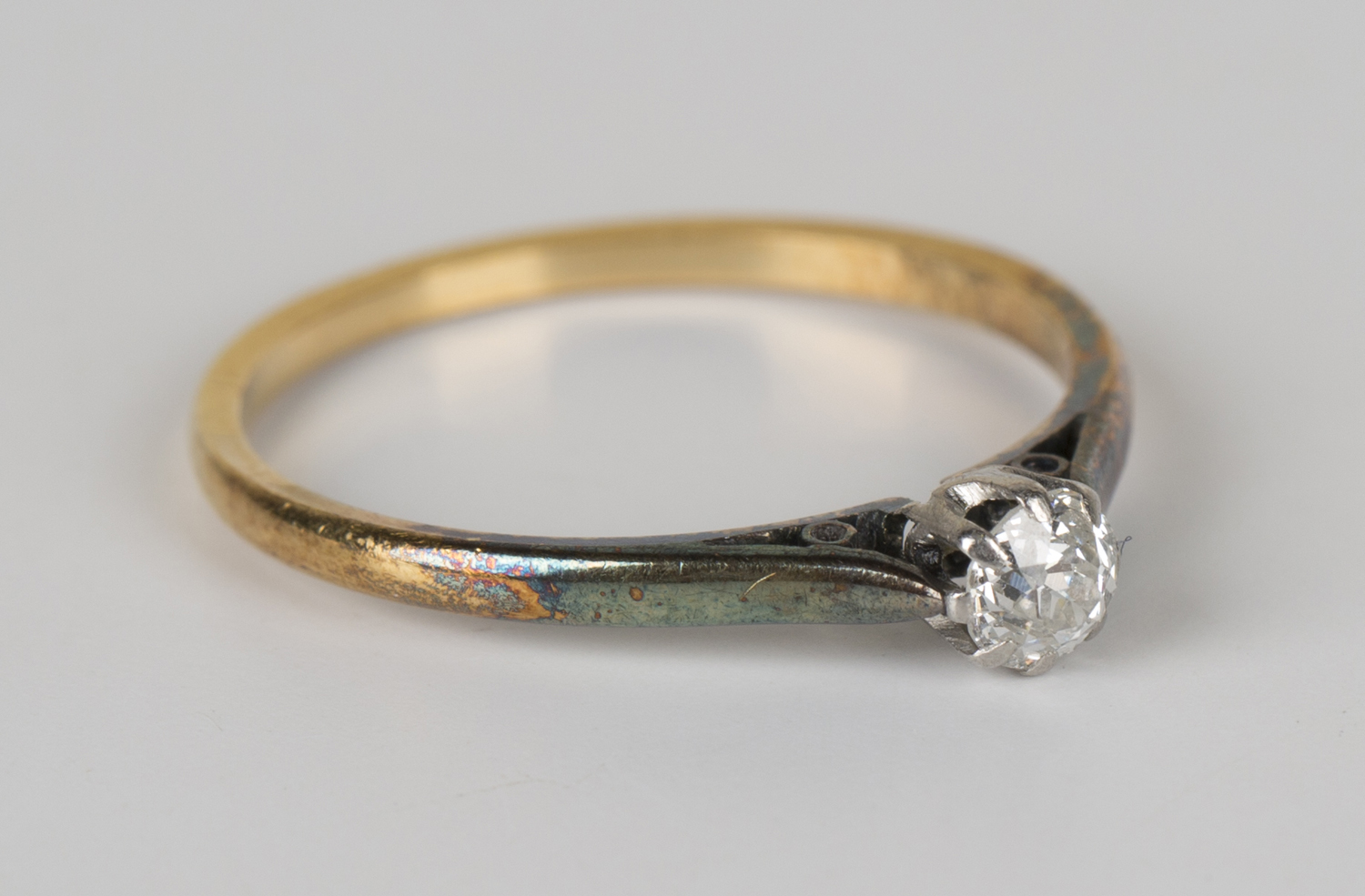 A gold, platinum and diamond single stone ring, claw set with a cushion shaped diamond, detailed '18ct - Plat', ring size approx O1/2.