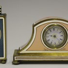 An early 20th century Continental gilt metal and enamel bedside timepiece, the circular dial with black Arabic numerals, the carriage-style case of rectangular form with upright handle, decorated with blue enamelled panels within white borders, on ball feet, height 6.6cm, together with a similar gilt metal and peach pink enamelled bedside timepiece, on bun feet, height 5cm (some faults).