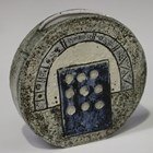 A small Newlyn Troika pottery wheel vase, 1970s, decorated by Simone Kilburn, monogrammed, with abstract geometric motifs against a textured pale green ground, black painted marks to base, height 11.5cm.