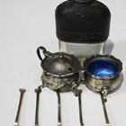 A George V silver salt and matching mustard with blue enamelled interiors, Birmingham 1925 by Alexander Clark & Co Ltd, together with five silver coffee spoons and a plated, leather and glass hip flask (lacking cup).