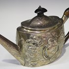A George III silver teapot of oval form, later embossed and engraved with flowers and scrolling leaves framing opposing cartouche, each inscribed 'Presented to Mr George Stephenson as a testimonial of respectful esteem by the workmen under his Immediate Superintendance at Messrs Peters & Sons Coach Manufactory', London 1798 by Solomon Hougham, length 29cm.