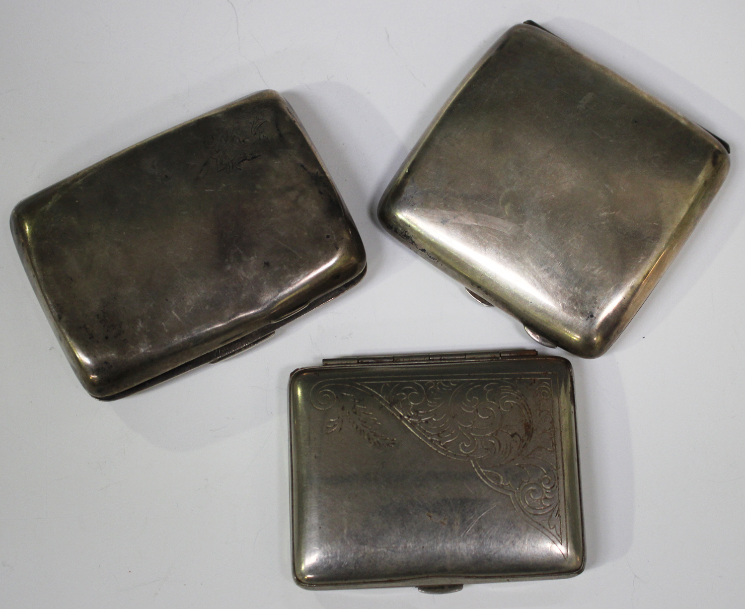 A George V silver curved square cigarette case, Chester 1910 by James Deakin & Sons, length 8cm, a silver rectangular cigarette case, Birmingham 1896 by Deakin & Francis Ltd, and a plated cigarette case.