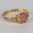 A 12ct gold, pink paste and seed pearl ring, mounted with four pink pastes and five seed pearls in a scroll mount, Birmingham 1872, ring size approx L1/2, with a case.