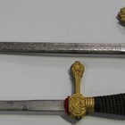 A pair of mid-20th century court type swords, the etched blades detailed 'Fabrica de Toledo (Spain)', blade length 73cm, with shaped cast metal hilts and wire bound grips (faults and losses), with gilt metal applied leather scabbards.