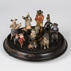 A group of nine late 19th century and early 20th century Austrian cold painted bronze novelty miniature figures of amusing animals, including two standing pigs holding their piglets, a fox dressed as a huntsman, a cat dressed as a fireman and a pug dog wearing a top hat, all beneath a glass display dome, diameter 15cm, with ebonized stand.