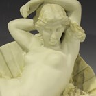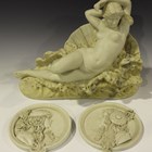 A late 20th century cast resin faux marble figure of a recumbent Venus emerging from the sea, supported by a base of waves and a scallop shell, width 46cm, together with a pair of moulded composition wall plaques.