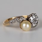 A gold, diamond and cultured pearl ring, claw set with a circular cut diamond and a single cultured pearl with diamond set four stone shoulders in a cross-over design, ring size approx M1/2.