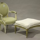 A 20th century Louis XVI style French cream and gilt painted fauteuil armchair, height 96cm, width 67cm, together with a similar footstool, height 40cm, width 71cm, depth 62cm.