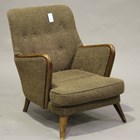 A mid-20th century stained walnut showframe tub back easy chair, upholstered in brown fabric, on outswept legs, height 81cm, width 68cm.