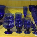 A group of blue glassware, 20th century, including a set of six champagne flutes, a large footed serving bowl and a jug.