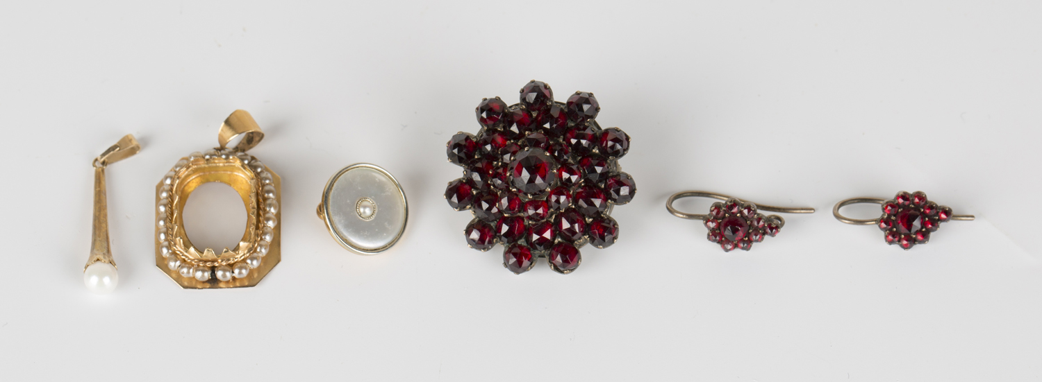 A Bohemian garnet brooch of shaped circular form, diameter 2.5cm, a pair of Bohemian garnet earring tops with wire fittings, a gold and imitation pearl pendant, detailed 'C18', length 2.7cm (the central gem lacking), a 9ct gold and cultured pearl pendant and a gold, mother-of-pearl and seed pearl button, detailed '18ct'.