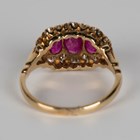 A gold, ruby and diamond ring, mounted with three graduated oval cut rubies within a surround of circular cut diamonds between split shoulders, unmarked, ring size approx M1/2.