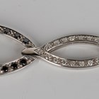 A 9ct white gold, black diamond and diamond pendant of folding oval triple section form, mounted with circular cut black diamonds alternating with circular cut diamonds, length 7.5cm.
