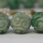 A Chinese single row of eighteen jadeite prayer beads, each with carved decoration, divided by two larger hardstone spacer beads, one issuing a gilt metal and rose quartz tassel drop, length 24cm, within a silk covered cylindrical box, the cover with shou medallion.