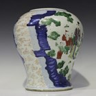 A Chinese wucai porcelain jar, Transitional period, mid-17th century, the high-shouldered body painted with a continuous scene of four maidens surrounded by children in an outdoor setting, divided by cloud vapours, underglaze blue double-ring to base, height 28cm (haircrack and reduced neck).