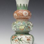 A Chinese famille verte porcelain triple-gourd shaped vase, Kangxi style but late Qing dynasty, painted with panels of birds in blossoming branches and Buddhistic lions in garden settings, reserved against green grounds filled with lotus tendrils and precious objects, underglaze blue double-ring and green enamelled leaf mark to base, height 34.2cm (repaired neck).