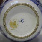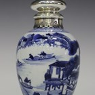 A Chinese blue and white export porcelain tea caddy, Kangxi period, of ovoid form, painted with a continuous landscape including figures, boats and pagodas beneath a chevron band, underglaze blue painted mark to base, height 11cm, fitted with a later Dutch silver cover with floral finial.