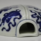 A Chinese blue and white porcelain leaf shaped wall vase, 18th century style but later, the ten veined segments painted with Buddhistic symbols, unmarked, length 14.5cm.