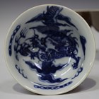 A set of six Chinese blue and white Batavian export style porcelain stem cups, 20th century, each bowl interior painted with a dragon, each exterior and stem covered in a café-au-lait glaze, height 8.2cm.