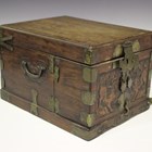 A Chinese brass mounted hardwood rectangular dressing table box, late 19th century, the hinged cover revealing a mirror, the double hinged front carved in low relief with a pair of Buddhistic lions, opening to reveal drawers, on a plinth base, the front carved with archaistic scrolls, length 29cm, height 18cm (faults).