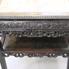 A Chinese hardwood two-tier centre table, late 19th century/early 20th century, the rectangular top inset with a rouge marble panel with a carved gadrooned border, the frieze carved in low relief with lotus and scrolling leafy tendrils, the apron carved and pierced with further lotus within archaistic scroll borders, raised on Buddhistic lion mask and foliate shouldered legs, united by an undertier, on claw and ball feet, height 81cm, length 86cm, depth 67.5cm.