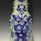 A Chinese blue painted celadon glazed porcelain vase, early 20th century, the shouldered body and flared neck painted with two fenghuang (phoenixes) amidst peonies, beneath a pair of Buddhistic lion cub handles, height 56.5cm (hairline to body).