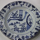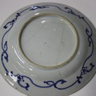 A Chinese blue and white porcelain soup plate, Yongzheng period, the well painted with a sword-wielding warrior and two maidens as a further figure watches from a pavilion window, diameter 21.8cm (rim repaired), together with five other Chinese blue and white plates, Kangxi period, painted with various designs of flowers, birds and flower baskets, diameters ranging from 21cm to 23cm (some faults).