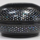 A Chinese laque burgauté circular seal box and cover, late Qing dynasty, finely inlaid with flowers within a complex geometric border, diameter 8cm.