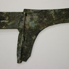 A Chinese archaic bronze dagger axe head, probably Han dynasty, covered in a verdigris patination, length 17.7cm, bearing 'F.S. Clark Collection' label detailed 'China 94-12'. Provenance: formerly from the collection of the late Frederick Sydney Clark (1923-2016).