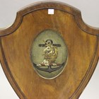 A pair of 19th century mahogany shield back hall chairs, each back inset with an oval panel painted with a coat of arms, the solid seats raised on square tapering legs and spade feet, height 98cm, width 42cm (some repairs).