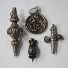 A Victorian silver child's rattle, decorated with bands of flowers and leaves, with whistle terminal, Birmingham 1869 by George Unite, length 8.3cm (lacking teething handle and bells), together with another smaller child's rattle, a disc shaped child's rattle and a silver finial, modelled as a seated teddy bear, Birmingham 1917, height 4cm.