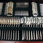 A late 20th century canteen of Harrods plated Grecian pattern cutlery, comprising twelve table knives and forks, four tablespoons, twelve dessert knives, forks and spoons, twelve fish knives and forks, three-piece carving set, twelve soup spoons, twelve tea and coffee spoons, twelve cake forks, twelve fruit knives, soup ladle, two sauce ladles, cake slice, cheese knife, two butter knives, pair of salad servers and twelve steak knives, within a hinged lid canteen box with two drawers.