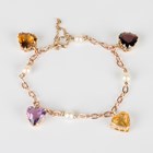 A gold, gemstone and cultured pearl bracelet, the oval link chain fitted with four heart shaped gemstone pendant charms alternating with four cultured pearls, on a boltring clasp, detailed '9ct', length 18cm.