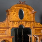 A pair of Edwardian Neoclassical Revival satinwood side cabinets, in the manner of Edwards & Roberts, both finely inlaid with ribbon and bellflower swags supporting flower-filled baskets, all within line borders, the arched frieze backs with carved flaming torch surmounts above bevelled glass panels flanked by open shelves with gilt-metal galleries, the bases with central cupboards flanked by glazed display shelves, raised on shaped legs united by undertiers, height 229cm, width 114cm, depth 39cm.