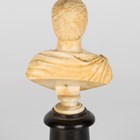 A small mid-19th century carved ivory head and shoulders portrait bust of a gentleman dressed in classical robes, raised on a turned ebony pedestal, height 13.5cm.