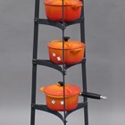 A group of Le Creuset orange enamelled kitchenware, comprising kettle, two saucepans and three further lidded cooking pots, together with a wrought iron pan rack, height 153cm (some faults).