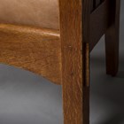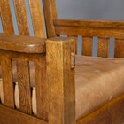 An early 20th century American Mission Arts and Crafts oak framed armchair, probably made by Harden Co, in the manner of Gustav Stickley, the curved bar and comb back flanked by flattened armrests, the brown leather seat raised on substantial block legs, the front joints showing mortise and tenon construction, height 97cm, width 74cm, depth 62cm.
