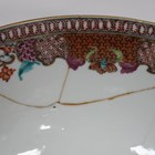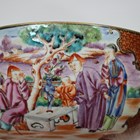 A Chinese famille rose export porcelain punch bowl, Qianlong period, painted in the Mandarin palette, the exterior with figural scenes against an iron red, black and gilt 'Y' diaper ground, the interior with similar figural roundel and borders, height 12.1cm, diameter 28.8cm (hairline crack and repair).