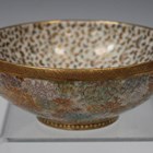 A Japanese Satsuma earthenware circular bowl by Kinkozan, Meiji period, the interior finely painted and gilt with a 'Thousand Butterflies', the exterior with millefleur, within iron red and gilt borders, gilt signature and applied 'Kinkozan' paper label to base, height 4.7cm, diameter 12.3cm (chip to rim interior).