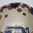 A Japanese Satsuma earthenware bowl, Meiji period, of steep sided circular form, the interior enamelled with a blue dragon beneath a border of blue, red and gilt kiku mon, the exterior with a band of blue bamboo beneath swathes of gilt clouds, enamelled indistinct signature and Shimazu mon to base, height 12cm.