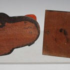 Two Japanese Kobe carved and painted wooden automaton toys, early 20th century, one modelled as a musician beating a drum with articulated head, arms and legs, height 9.5cm, the other a seated fish vendor raising a dish to his head, height 11cm (minor faults).