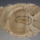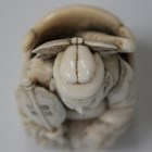 A Japanese carved ivory okimono figure, Meiji/Taisho period, finely modelled as a Chinese dignitary seated upon a horseshoe backed chair, holding a fan in his right hand, incised four-character mark to fan and three-character mark and seal to chair leg, height 10.5cm.